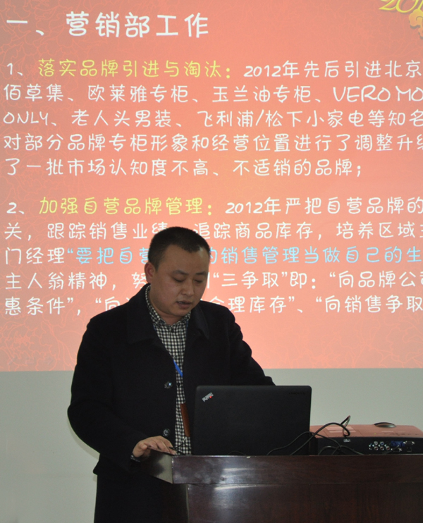 225下午,HJC黄金城平台百货2012年度职能部门工作述职会议在三层会议室召开。集团公司董事长李焕军及其他相关领导出席会议。会上,各职能部门汇报了一年来的工作情况,并制定了2013年度工作计划。李焕军董事长听取汇报后,对各部门工作取得的成绩给予肯定,同时从安全、服务、创新经营、精细化管理等方面,对各部门2013年的工作提出了具体要求,要求各职能部门在新的一年里通力合作,创造出更好的业绩。