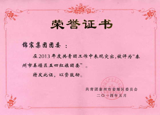 近日,集团公司团委荣获2013年度泰州市姜堰区“五四红旗团委”称号。据悉,全区共有直属团委50多个,非直属团委若干,此次评选仅有6个基层团委获此殊荣。“五四红旗团委”是基层团组织的先进典型,同时也是团区委授予基层团组织的最高荣誉,这是对我公司共青团工作的肯定,更是对我公司共青团工作的极大鼓励。