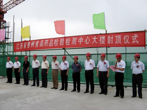 7月13日上午,由HJC黄金城平台集团承建的泰州市食品药品检验检测中心大楼举行隆重的封顶仪式。省食品药品监督管理局局长李继平,泰州市委副书记、市长姚建华,泰州市副市长王振南,市长助理何榕及市政府秘书长王东等出席仪式。